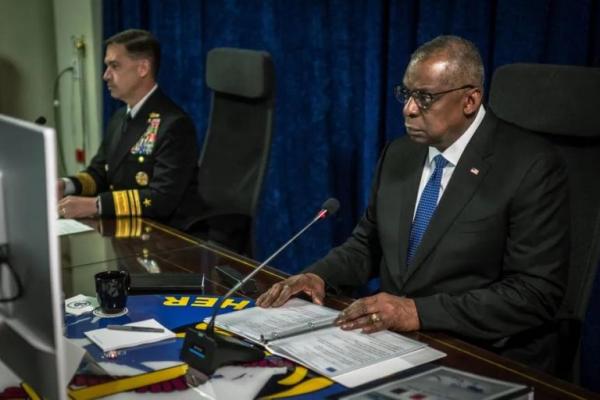 Menteri Pertahanan AS Lloyd J. Austin III dalam KTT Keamanan Laut Merah Virtual di markas besar NAVCENT di Manama, Bahrain 19 Desember 2023. Handout via Reuters