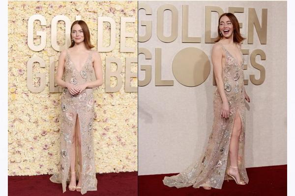 Emma Stone Tampil Menawan dengan Gaun Louis Vuitton Mawar Metalik di Golden Globes 2024. (FOTO: GETTY IMAGE)