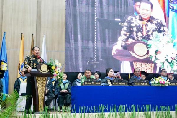 Ketua MPR Bambang Soesatyo (Bamsoet) dalam pengukuhan Prof. Dr. Dhaniswara K. Harjono sebagai Guru Besar Ilmu Hukum Bisnis di Universitas Kristen Indonesia Jakarta, Rabu (10/1/24). (Foto: Humas MPR)