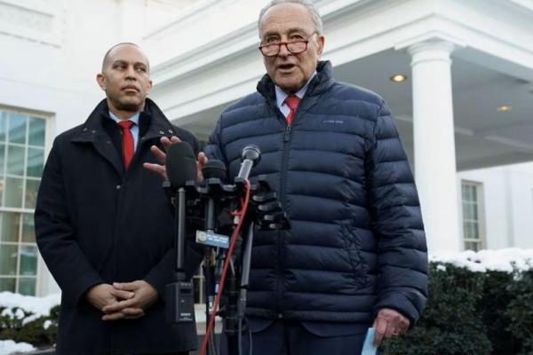 Pemimpin Mayoritas Senat Chuck Schumer dan pemimpin Partai Demokrat di Dewan Perwakilan Rakyat Hakeem Jeffries di Gedung Putih, Washington, AS, 17 Januari 2024. Foto: Reuters