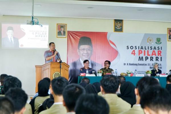 Ketua MPR Bambang Soesatyo (Bamsoet) dalam Sosialisasi Empat Pilar MPR RI hari ke-12 dalam kunjungannya ke Dapil-7 Jawa Tengah bersama sivitas akademika Universitas Perwira Purbalingga (UNPERBA), di kampus UNPERBA, Senin (29/1/24). (Foto: Humas MPR)