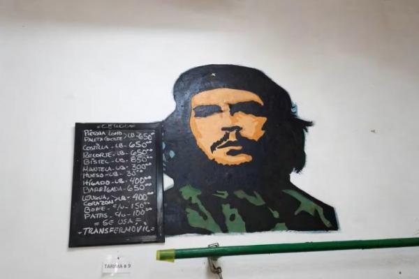 Grafik harga tergantung di kios daging di samping gambar mendiang pemimpin pemberontak Ernesto Che Guevara di sebuah pasar, di Havana, Kuba 23 Januari 2024. Foto: Reuters